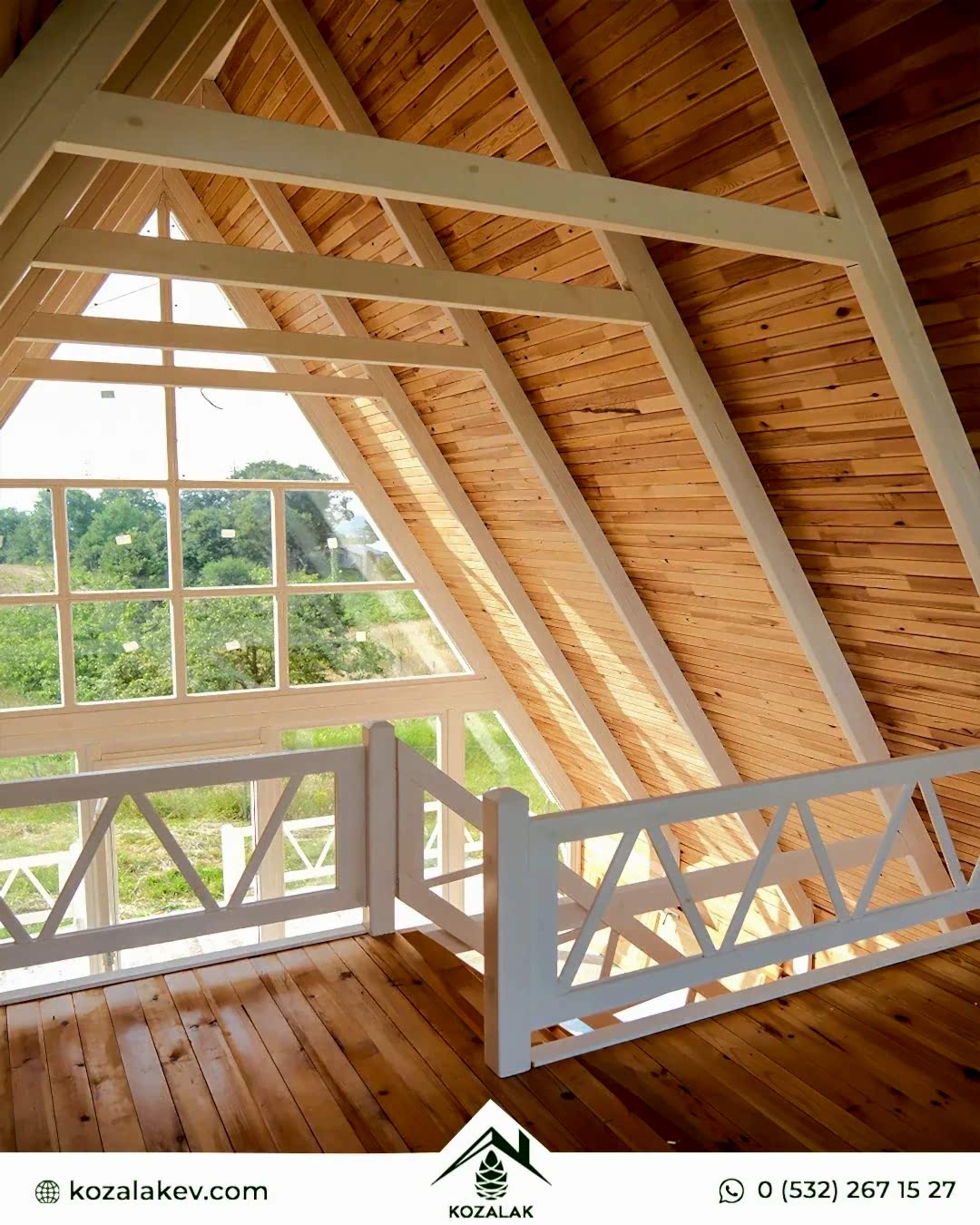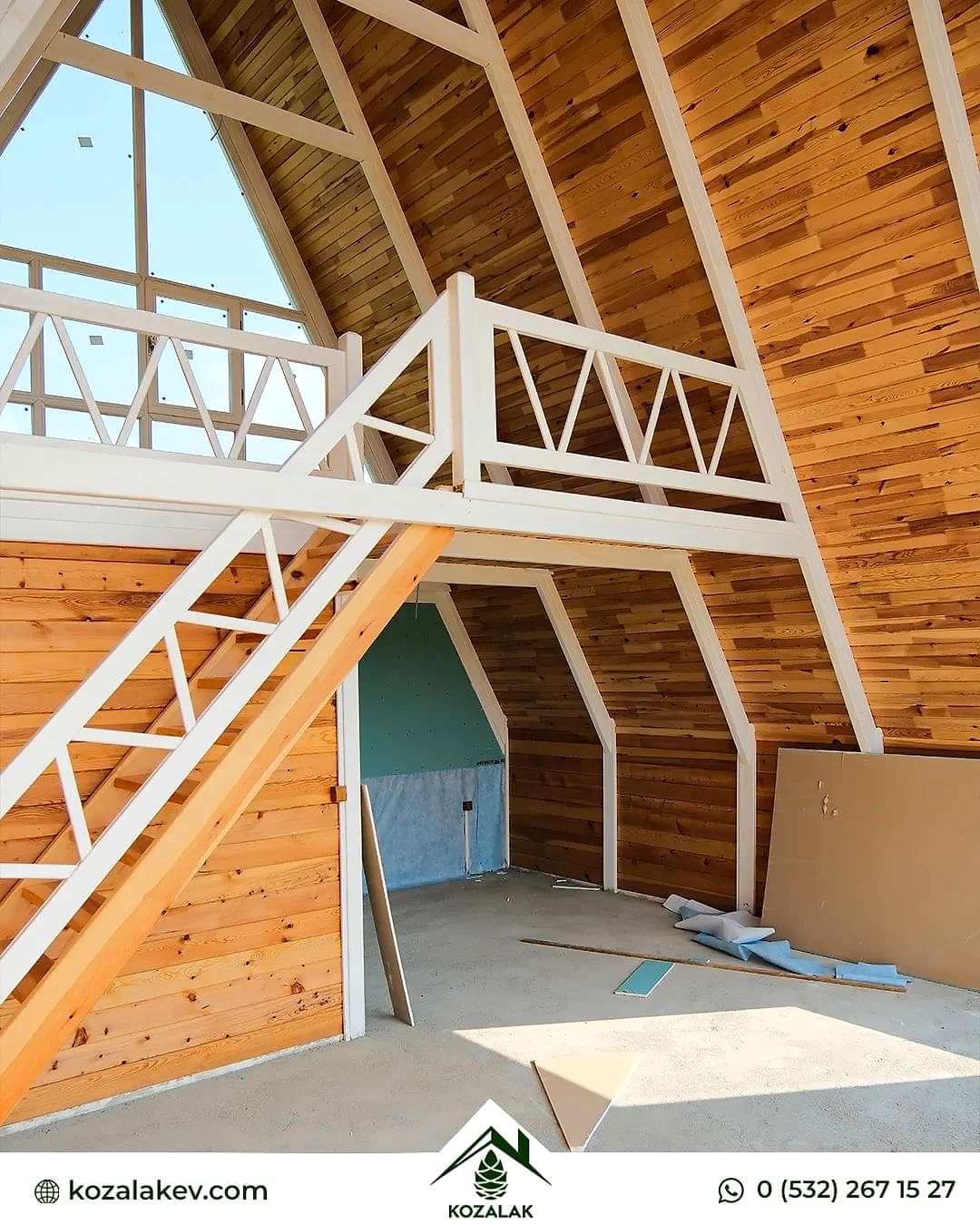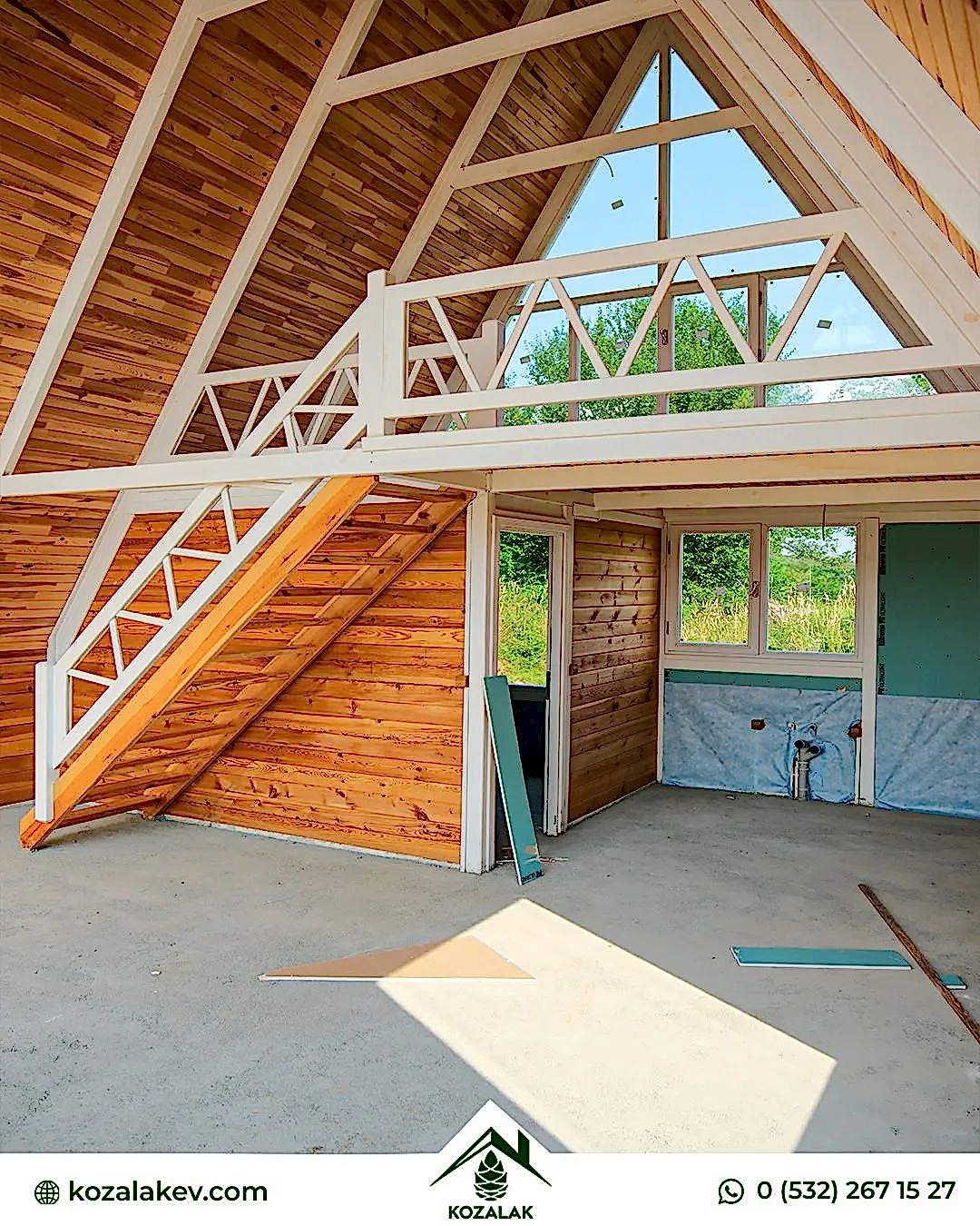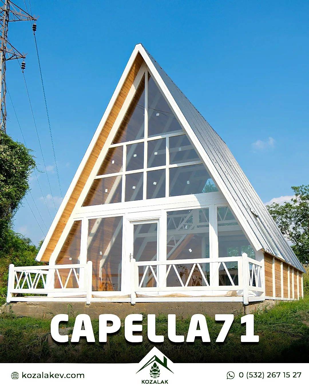71 m2 Capella71 model evimizin taban alanı 45m2 loft kat 13,5m2 veranda 12,5m2 olmak üzere toplam 71 m2’dir. Yükseklik 7,21m taban ölçüleri 6.25x7.25’dır. verandanın taban alanı ise 2x6.25'dir. Kullanılan kereste cinsi kurutulmuş sarı çamdır.