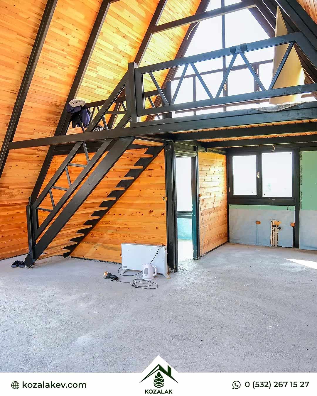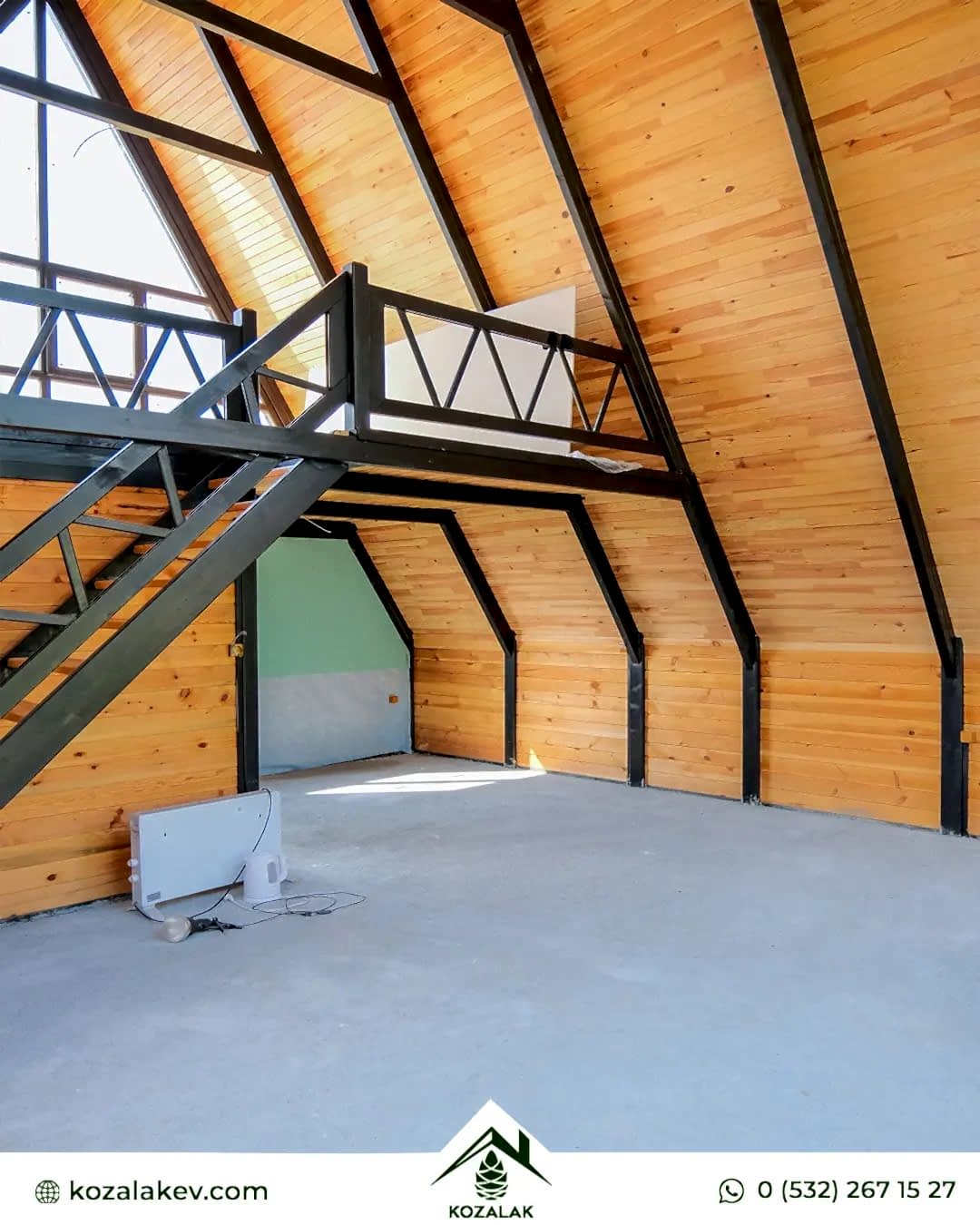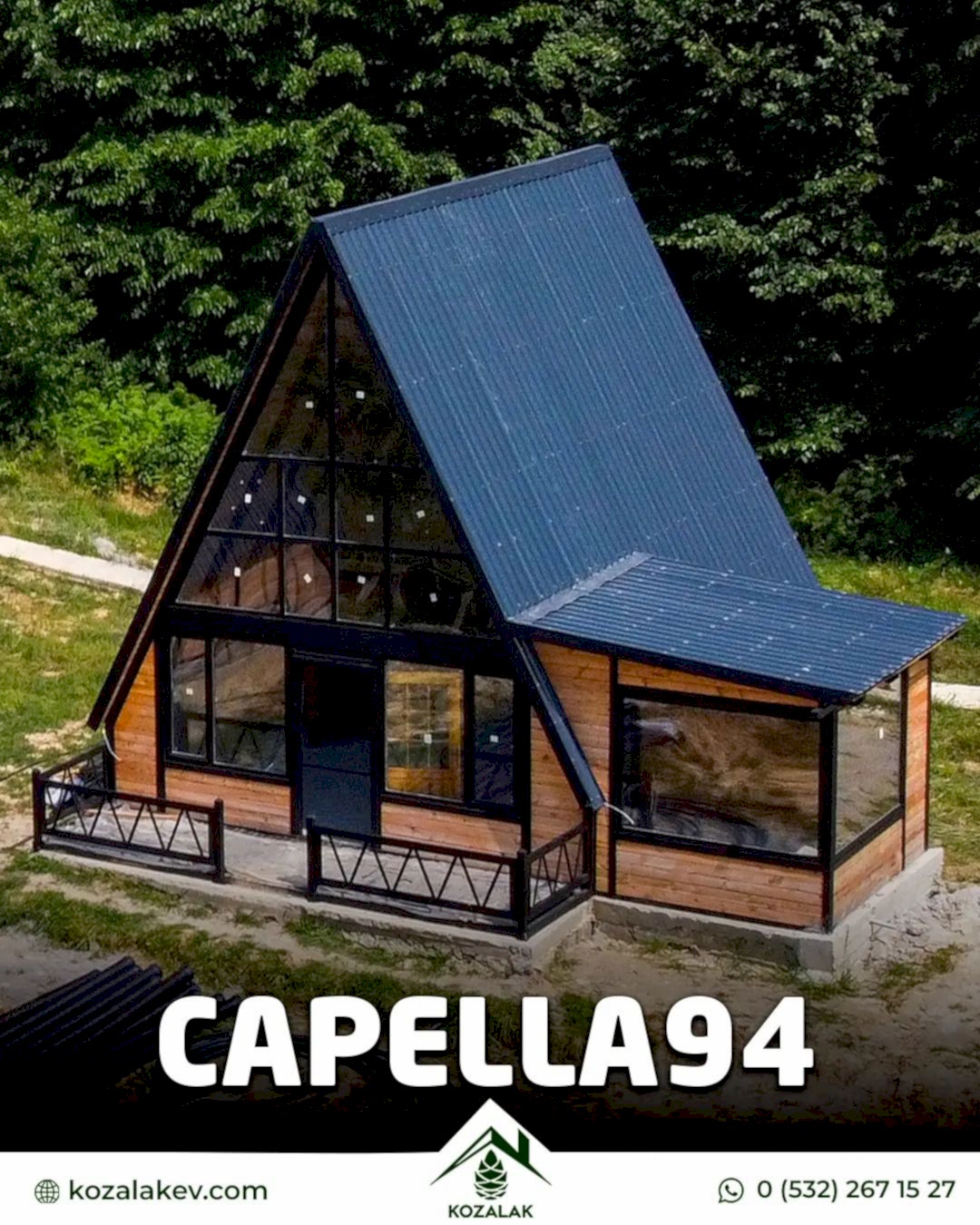 94 m2 Capella94 model evimizin taban alanı 57m2 loft kat 19m2 veranda 18m2 olmak üzere toplam 94m2’dir. Yükseklik 7.21m'dir. Kullanılan kereste cinsi kurutulmuş sarı çamdır.