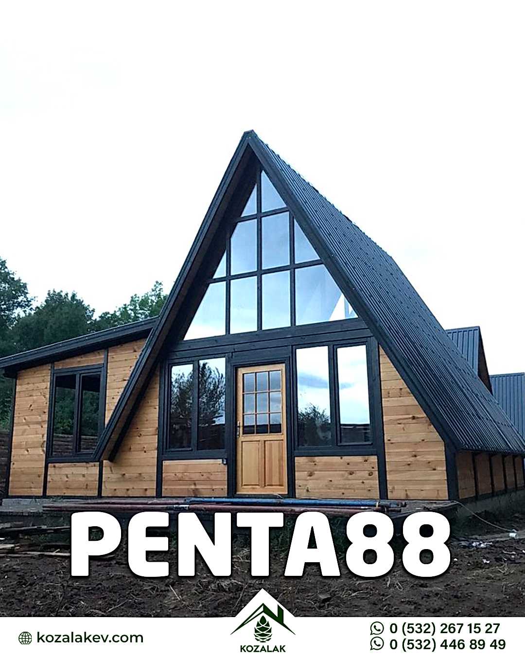 88 m2 Penta88 model evimizin taban alanı 56m2 loft kat 12m2 veranda 20m2 olmak üzere toplam 88 m2’dir. Yükseklik 6m taban ölçüleri 8.60x6.56’dır. Kullanılan kereste cinsi kurutulmuş sarı çam kullanılmaktadır.